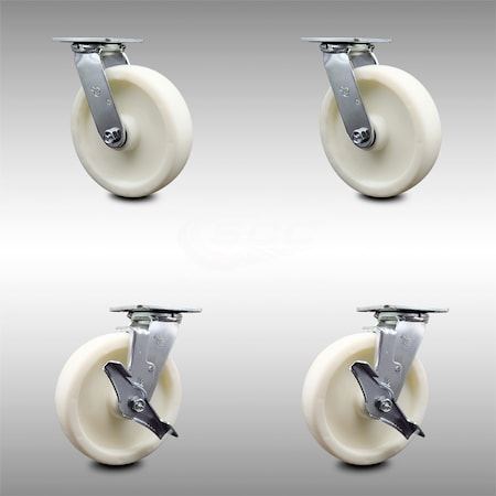 Stainless Steel Nylon Swivel Top Plate Caster Set of 4 w/8" x 2" White Wheels - Includes 2 Swivel with Brakes & 2 Swivel - 5000 lbs Total Capacity - Service Caster Brand