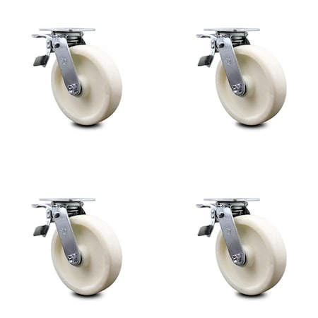 Nylon Swivel Top Plate Caster Set of 4 w/8" x 2" White Wheels - Includes 4 Swivel w/Total Lock Brakes - 5000 lbs Total Capacity - Service Caster Brand