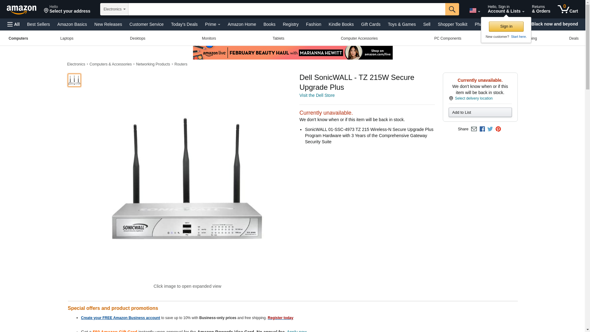Dell SONICWALL, TZ 215 Wireless-N Security appliance with 3 years SONICWALL, Comprehensive Gateway Security Suite 10Mb LAN, 100Mb LAN, GigE 802.11 a/b/g/n Dual Band SONICWALL, Secure Upgrade Plus Program - Dell SONICWALL, TZ 215 Wireless-N Security appliance with 3 years SONICWALL, Comprehensive Gateway Security Suite 10Mb LAN, 100Mb LAN, GigE 802.11 a/b/g/n Dual Band SONICWALL, Secure Upgrade Plus Program. SONICWALL, TZ 215W Secure Upgrade Plus 7 x 10/100/1000Base-T Network LAN IEEE 802.11n - SONICWALL, TZ 215 Wireless-N Secure Upgrade Plus 3 Yr CGSS - Marketing Information: - TZ 215 Series features. - The TZ 215 provides intelligent protection, business-class performance, advanced networking features and configuration flexibility in an affordable desktop appliance that's easy to set up, operate and manage. - High-performance security engine. - The SONICWALL, TZ 215 uses patented Reassembly-Free Deep Packet Inspection to examine traffic simultaneously across all ports without introducing latency to the network, enabling businesses to realize increased productivity gains. - Item-Type: - Network Security/Firewall Appliance. Item-Part-No#: 01-SSC-4973