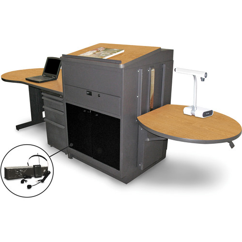 MVLDA7230OKDT-E Finish: Oak Features: -Vizion collection. -6 Speakers size: 2". -Adjustable platform size: 26 to 42". -16 Channel wireless transmitter bodypack with headset microphone. -50 Watt amplifier. -Lockable I/R friendly acrylic doors. Style: -Modern. Primary Material: -Metal. Powered: -Yes. Storage Included: -Yes. Clock Included: -Yes. Reading Light Included: -Yes. Wireless: -Yes. Sound System Included: -Yes. Country of Manufacture: -United States. Dimensions: Overall Height - Top to Bottom: -47". Adjustable Height: -Yes. Overall Width - Side to Side: -133". Overall Depth - Front to Back: -36". Overall Product Weight: -349 lbs.