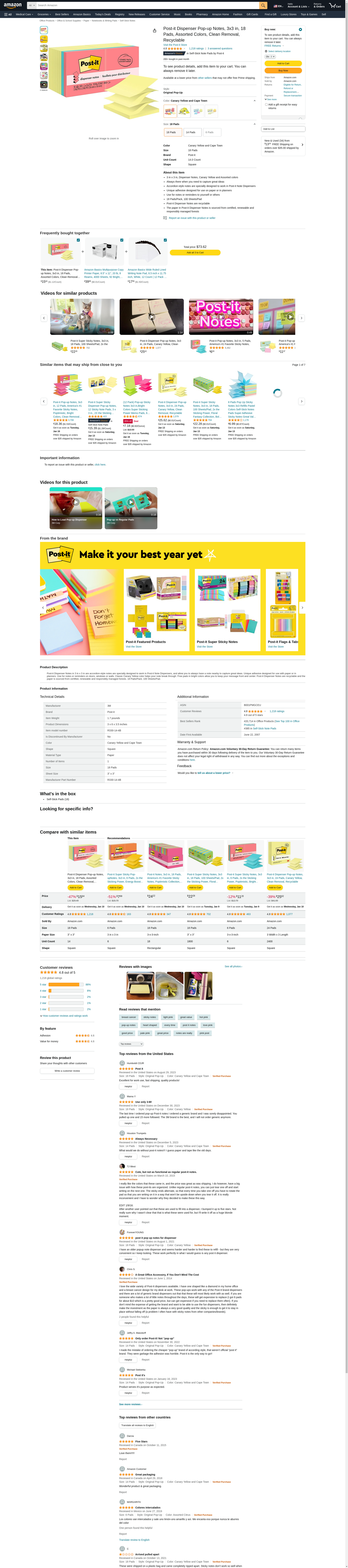 Post-it Pop-Up Original Notes Value Pack, 3 x 3 Inches, Assorted Colors, Pad of 100 Sheets, Pack of 18