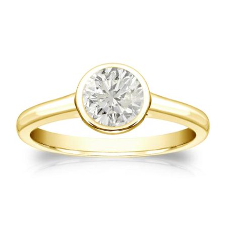 This beautiful solitaire engagement ring features a sparkling 1/2 ct TDW round-cut diamond in bezel setting. Crafted of your choice of 18-karat white or yellow gold and completed with a high polish finished. Handcrafted in the USA. <br /> <br /> <ul> <b>Center Stone:</b> <li>Diamonds: One</li> <li>Cut: Round</li> <li>Center diamond weight: 1/2 carats TDW</li> <li>Color: J-K</li> <li>Clarity: I1-I2</li> <li>Setting: Bezel</li> </ul> <b>Metal information and dimensions:</b> <ul> <li>Style: Solitaire</li> <li>Metal: 18k White Gold, 18k Yellow Gold</li> <li>Finish: High Polish</li> <li>Band width: 1-2 mm</li> </ul> <br /> <b>Total diamond weight: 1/2 carats TDW</b> <br /> <br /> <b><i>All weights and measurements are approximate and may vary slightly from the listed information. *T.W. (total weight) is approximate. 1/2 carat T.W. may be 0.45 to 0.57 carats. Treatment code N (Diamond). See <a href="http://www.overstock.com/2200/static.html"><span class="links">Treatment Guide</span></a> for further information.</i></b> <br />