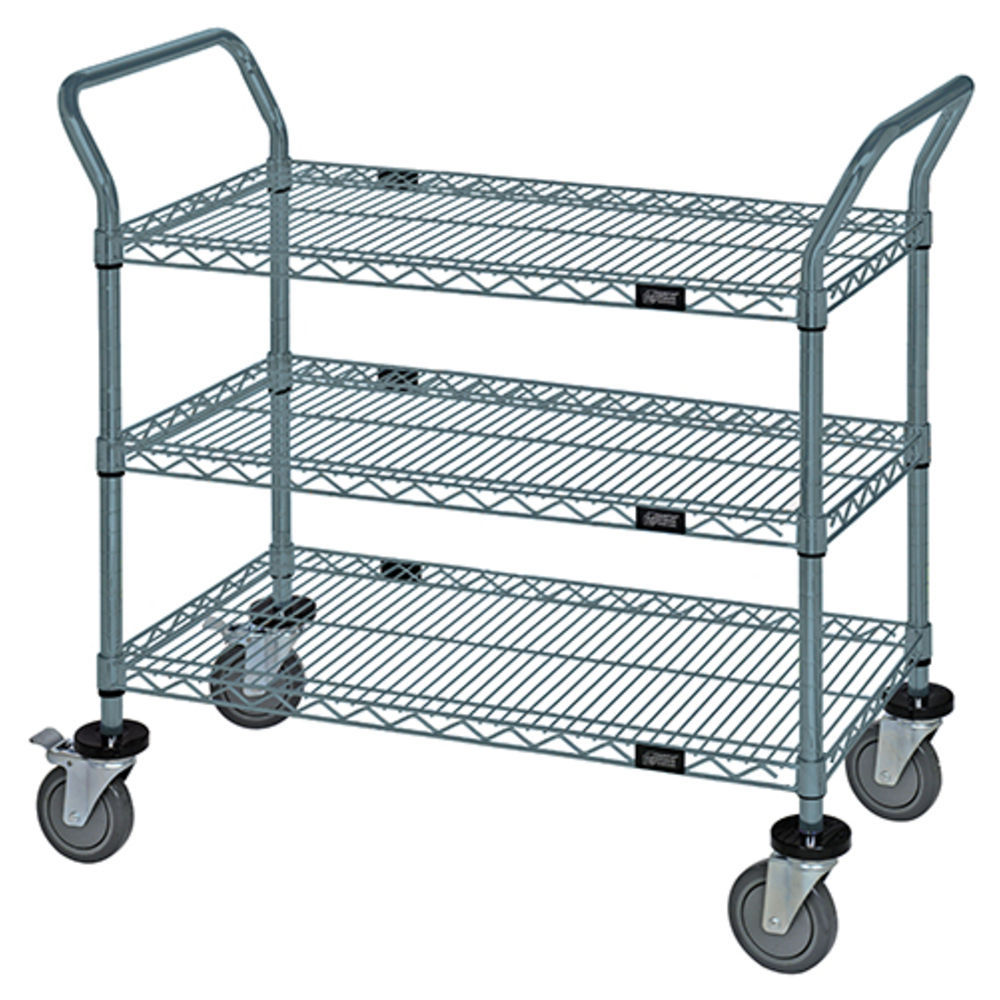 - Utility Cart, 48"W x 24"D x 37-1/2"H, (3) wire shelves, 1200 lb. capacity, (2) "U" shaped handles, open base, donut bumpers, (4) 5" polyurethane swivel casters (2 with brakes), gray epoxy finish, NSF