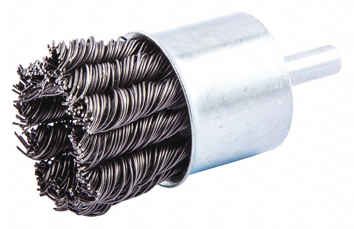 'End Brush, End Brush, Bristle Type Crimped Wire, Brush Dia. 1 In., Abrasive Shank Size 1/4 In., Wire Dia. 0.020 In., Bristle Trim Length 7/8 In., Abrasive Material Carbon Steel, Max. RPM 20,000, Overall Length 2-7/8 In.'