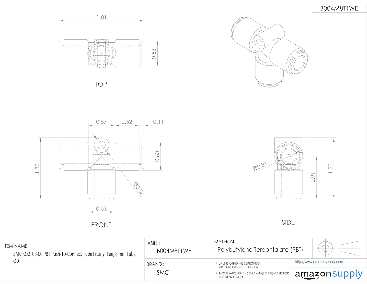 SMC KQ2T08-00A PBT Push-to-Connect Tube Fitting, Union Tee, 8 mm Tube OD