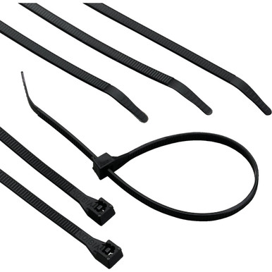 15 Pack, 8", Black, Cable Tie, Nylon, Ultra Violet Resistant, 75 LB Tensile Strength, 1 Piece, Self Locking, Bagged.