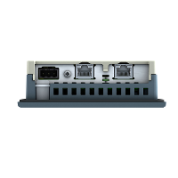 This Magelis GTO IP65 touchscreen operator interface (HMI) is supplied with 24V DC, has a 3.5" color TFT LCD display, 320 x 240 pixels (QVGA), 6 function keys and 96MB EPROM. It also has 1 host + 1 mini-B USB ports, 1 RS232C port and 1 Ethernet TCP/IP port. It is ideal for optimized information and communication with automation systems in industry and infrastructure such as compact machines, handling systems, food & beverage machines and pharmaceutical industry. The screen displays text messages, graphic objects and mimic diagrams, control and configuration of data. Its RS485 host port makes it ideal to supervise and control simple systems and machines. It is easily programmable with Vijeo Designer, with almost not coding needed.