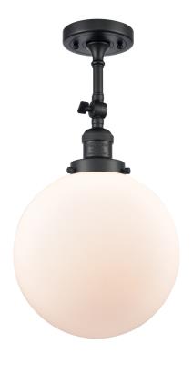 INNOVATIONS LIGHTING 201F-BK-G201-10 X-Large Beacon 1 Light Semi-Flush Mount part of the Franklin Restoration Collection. The X-Large Beacon 1 Light Semi-Flush Mount is part of the Franklin Restoration Collection. Solid Brass 180 Degree Adjustable Swivel with internal teeth that lock in at 5 degree intervals With Engraved Cast Cup. Collection: Franklin Restoration. Material: Steel, Cast Brass, Glass. Metal Finish(Body): Matte Black. Metal Finish(Canopy/Backplate): Matte Black. Dimension(in): 10(W) x 16(H) x 10(Dia). Bulb: (1)100 Medium Base Vintage Bulb recommended(Not Included). Voltage: 120. Glass: Matte White Cased Beacon/Frosted. Shade Shape: Globe. Shade Material: Glass. Shade Size(in): 10 X 9.75. Shade Fitter Measurement: 3.25 inch Fitter. Canopy Dimension(in): 4.5. Solid Brass 180 Degree Adjustable Swivel with internal teeth that lock in at 5 degree intervals With Engraved Cast Cup. Slope Ceiling Compatible. Fixture can be hung with bulbs facing up or down as a Wall Mount or Facing Down as a Ceiling Mount. UL/CUL Damp Rated. Warranty: 2 Year Finish, Lifetime Electrical.