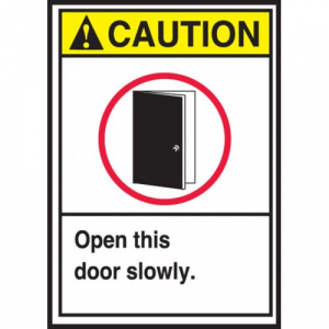 - Price For: Each Metal Detectable: No Material: Vinyl Legend Style: Text and Symbol Item: Label Subject Matter: Instruction Height: 5" Legend Color: White Background Color: Black, White Header: Caution Language: English Shape: Rectangle Self-Adhesive: Yes Legend/Background Color: Black/White Header Background Color: Yellow Legend: Open This Door Slowly