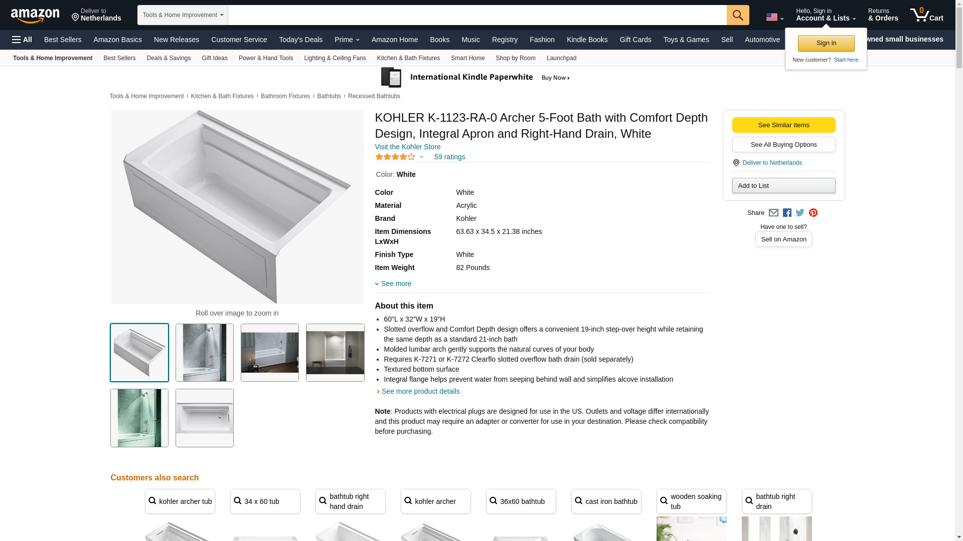 KOHLER K-1123-RA-0 Archer 5-Foot Bath with Comfort Depth Design, Integral Apron and Right-Hand Drain, White