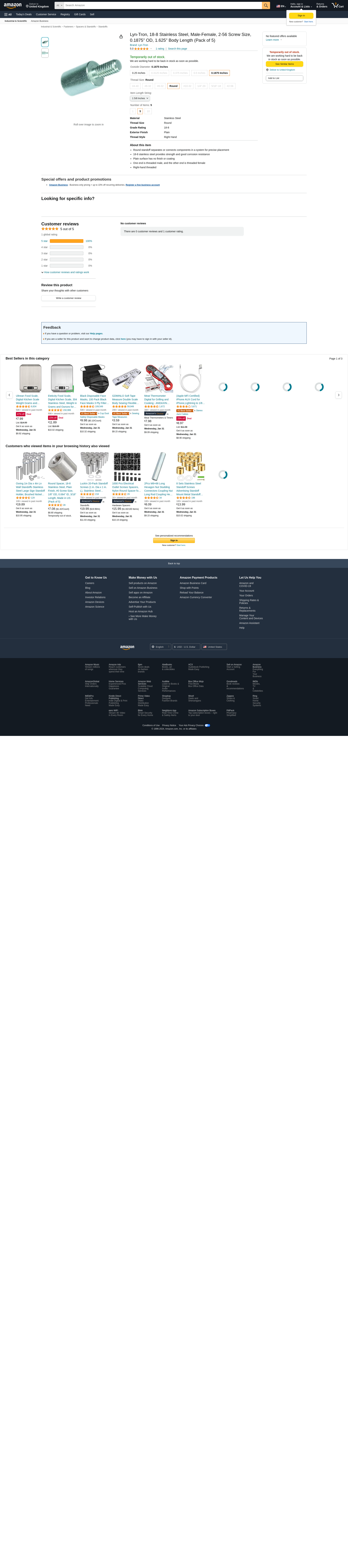 Lyn-Tron, 18-8 Stainless Steel, Male-Female, 2-56 Screw Size, 0.1875" OD, 1.625" Body Length (Pack of 5)