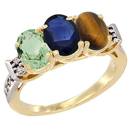 10K Yellow Gold Natural Green Amethyst, Blue Sapphire & Tiger Eye Ring 3-Stone Oval 7x5 mm Diamond Accent, sizes 5 - 10
