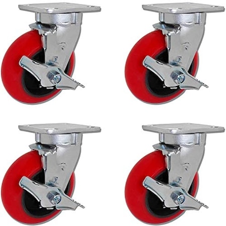 Caster Barn - 5" x 2" Swivel Caster Set of 4 W/Brakes - Red Crowned Poly on Iron - 3,200 LBS Per Set