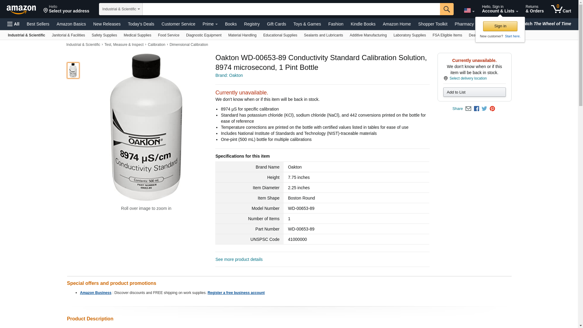 Oakton, WD-00653-89, 8974 uS Conductivity Standard Calibration Solution, 1 Pint All OAKTON Conductivity/TDS calibration solutions are cross checked using different test methods, premixed, and ready to use. OAKTON conductivity/TDS solution bottles are labeled with the name and CAS number for all ingredients to conform with "Right-to-Know" requirements, and includes an MSDS. Solutions come in one pint bottles.