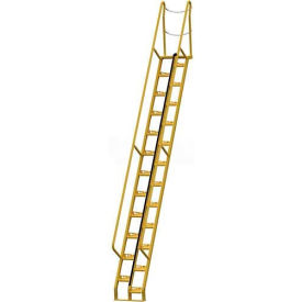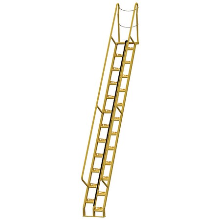 Vestil's Alternating-Tread Stair design offers a shorter span than traditional steps for a safe, space-saving set of stairs you can use almost anywhere. Designed for safety, with a handrail on each side of the unit and dual safety chain at the top. Welded steel construction with bolt-on handrails. U.S.A. Base Size W x D in. 23 1/2 x 117 1/2, Steps qty. 24, Dimensions L x W x H in. 117 1/2 x 23 1/2 x 210 1/8, Finish Type Yellow powder-coat, Step Width in. 9 1/8, OSHA Approved Yes, Safety Chain Included Yes 2, Step Depth in. 10 1/2 excluding top step, Step Type Steel steps w/raised surfaces, Top Step Height in. 168, Top Width in. 23 1/2, Material Type Steel, Degree of Angle 56. Sturdy welded steel construction handles up to 350-lb. uniform capacity Formed steel steps with raised surfaces to provide better traction Durable, powder-coated yellow safety finish Top step measures 14-ft. high Ships knockdown, some assembly required Model Number: ATS-14-56. Size: 24. Color: Yellow. Age Group: Adult.
