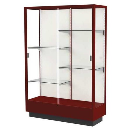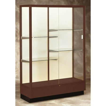 Waddell 891Mx The traditional good looks and solid construction of The Heritage Series make our hardwood frame cases the most popular in the Waddell line. With their classic styling, Heritage Series cases will stand the test of time as well as they stand up to school environments. Features: -Standard sliding tempered glass doors -Includes four 14" deep half-length shelves with brackets -Built in locks and levelers -Choose from plaque fabric, mirror, or white laminate backing -Plaque fabric backing is an off-white color and is designed to work with Velcro and will allow easy mounting -Reflective mirror back adds luster and class -White laminate background is constructed of melamine and is washable and stain-resistant -Choose from 3 hardwood finishes: Honey Maple, Danish Walnut, and Cordovan -Available with an optional cornice/lighting fixture (see SKU WA1146) -Dimensions: 48" L x 70" H x 18" D (including 10"H base) Case Back: Plaque Fabric, Wood Color: Cordovan