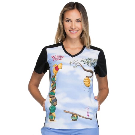 Ideal for pediatric settings this Tooniforms by Cherokee Women's V-Neck Knit Panel Winnie the Pooh Print Scrub Top illustrates your favorite honey-loving bear. Contrast knit side panels hug your figure to create a fitted and flattering silhouette. Missy modern classic fit Contrast banded v-neckline Short contrast sleeves Contrast knit side panels Two hidden front slip pockets Double needle topstitching throughout Ciel blue multi Reach For The Hunny Disney® character print Ideal for pediatric settings Ideal for veterinary settings 100% cotton Center back length: 25½"
