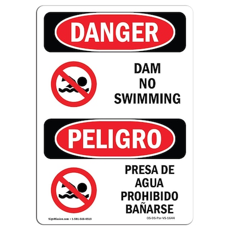 OSHA Danger Sign, Dam No Swimming Bilingual, 18in X 12in Decal