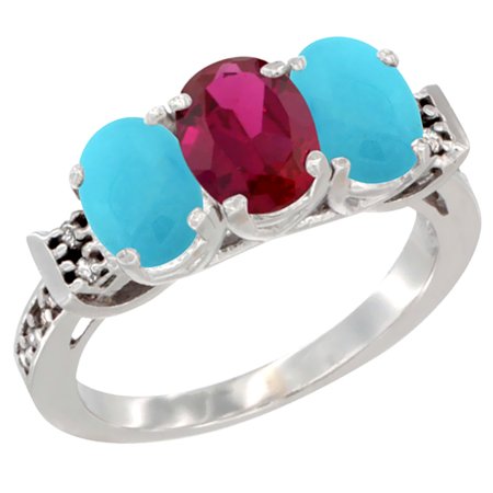 10K White Gold Enhanced Ruby & Natural Turquoise Sides Ring 3-Stone Oval 7x5 mm Diamond Accent, sizes 5 - 10