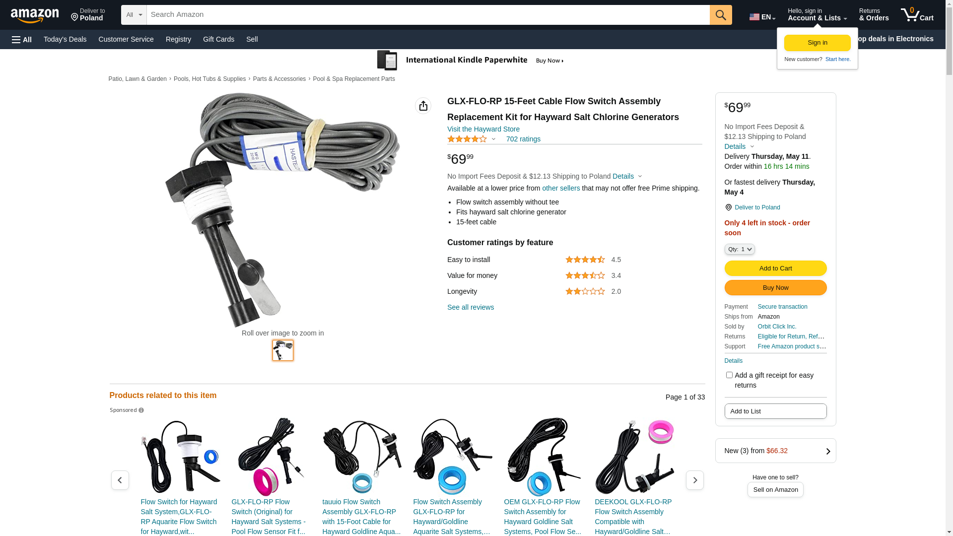 Hayward GLX-FLO-RP Aquarite Pro Aquaplus Aqua Trol Sense & Dispense Prologic Oncommand E-Command 4 Flow Switch (15' Cable, No Tee)