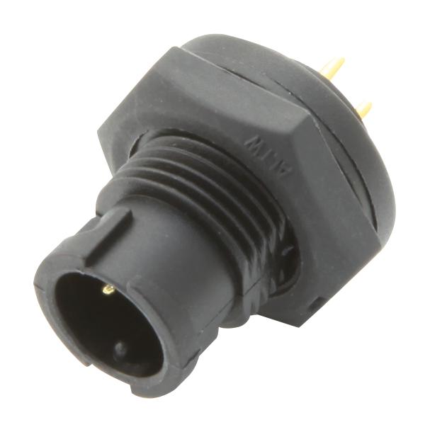 Sealing: IP67<br>Shielding: No<br>Connector Type: Circular<br>Connector Style: Plug<br>Mounting Type: Front Mount<br>Endbell Type: Circular<br>Number of Contacts: 3<br>Contact Style: Pin<br>Termination Method: 180¡ã PCB Type<br>Insert Arrangement: 3<br>Contacts Supplied: Yes<br>Contact Material: Copper Alloy<br>Contact Plating: Gold<br>Shell Material: Nylon<br>Shell Plating: No Plating<br>Shell Color: Black<br>Insert Material: Nylon<br>Amperage Rating: 5A<br>Operating Temperature: -40¡ãF to +-221¡ãF (-40¡ãC~105¡ãC)<br>Contact Mating life: 1000<br>RoHS: Yes