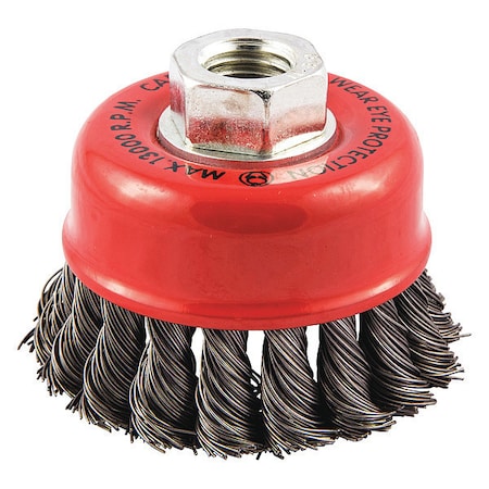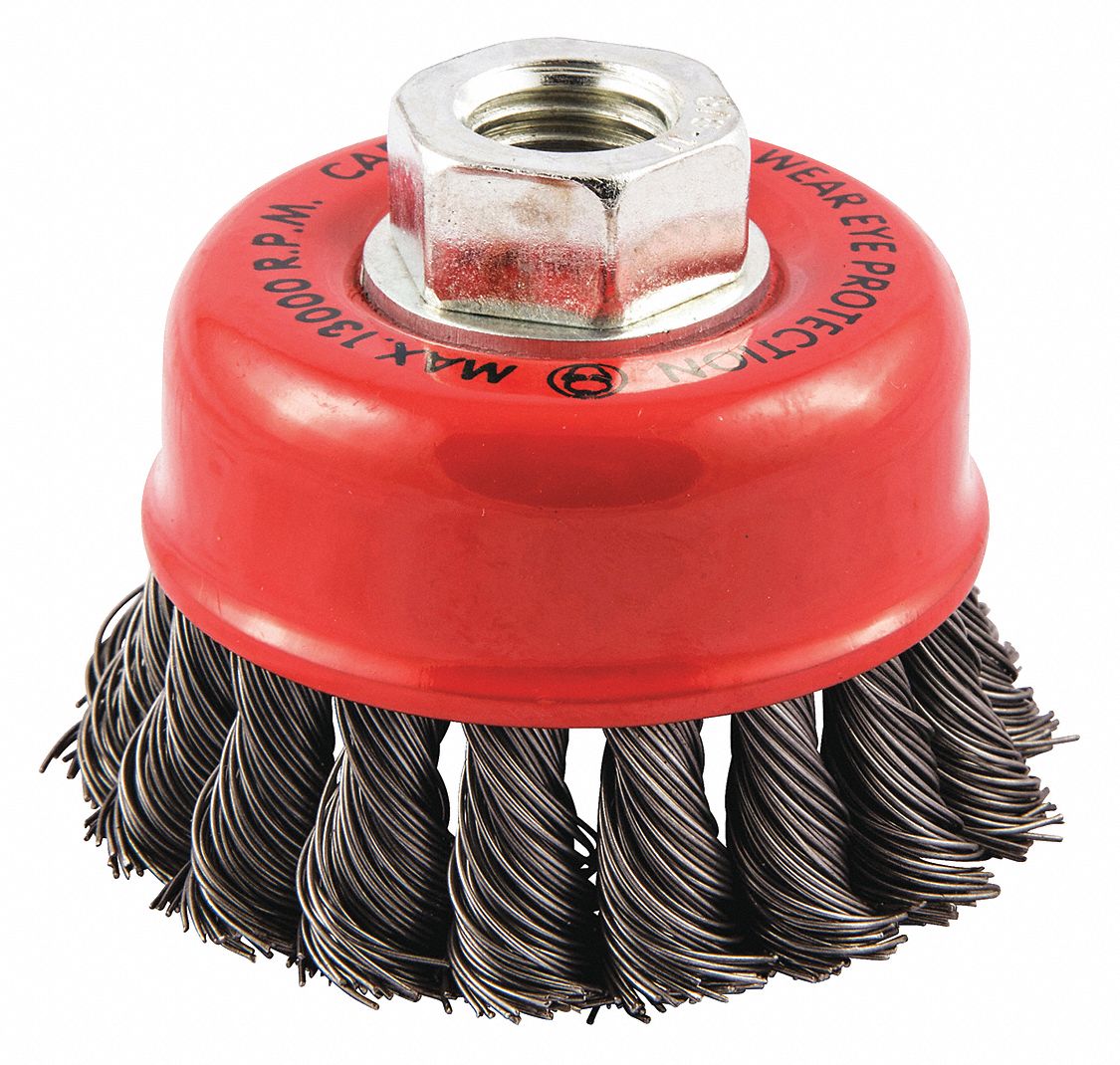 Cup Brush, Cup Brush, Bristle Type Knotted Wire, Brush Dia. 3 1/2 in, Mounting Type Arbor Hole, Arbor Hole Size 5/8 In.-11, Abrasive Shank Size No Shank, Wire Dia. 0.02 in, Bristle Trim Length 7/8 in, Abrasive Material Carbon Steel, Max. RPM 13,000 RPM