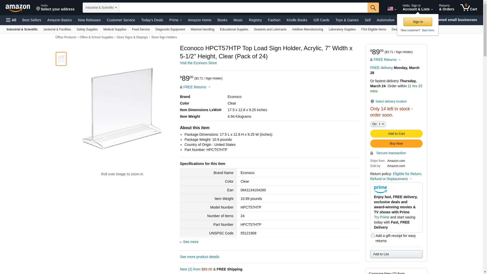Econoco HPCT57HTP Top Load Sign Holder, Acrylic, 7" Width x 5-1/2" Height, Clear (Pack of 24)