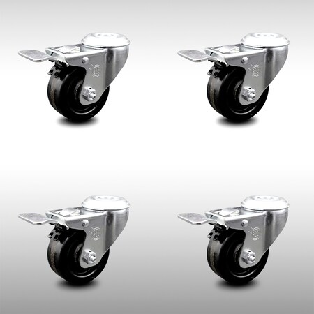3 Inch SS Phenolic Wheel Swivel Bolt Hole Caster Set with Total Lock Brake SCC