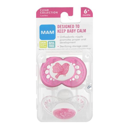 <ul> <li>MAM Clear Collection Pacifier 6+months - 2 CT.</li> <li>MAM Clear Collection Pacifier 6+months.</li> <li>Designed to keep baby calm.</li> <li>Orthodontic nipple promotes proper oral development.</li> <li>Sterilizing storage case.</li> <li>Skin soft silicone.</li> <li>BPA free.</li> <li>Innovative shield: Curved shield, big air holes, and innovative inside surface all comfort baby and helps to prevent skin irritation.</li> <li>Easy hold button: Easy to grab and easy to attach to a pacifier clip.</li> <li>Skinsoft silicone nipple: Silicone nipple with skinsoft texture that feels more like mom and is easily accepted by babies.</li> <li>Orthodontic: Ideal for oral development.</li> <li>The nipple adapts to baby's mouth, so the pacifier is always in the correct position.</li> <li>Mam Skinsoft nipple: A silky textured surface that feels familiar to babies.</li> <li>Our pacifiers are the result of unique MAM teamwork with pediatricians, dentists and orthodontists.</li> <li>Thanks to a silky textured nipple, a perfect fit for baby's mouth and a special shield design, MAM pacifiers are comfortable for babies and reassuring for parents.</li> <li>Proven effect: A market research confirms that 94% of babies accept the MAM Skinsoft nipple*.</li> <li>(*Market research 2010-2014, tested with 1.236 babies.).</li> <li>Available in 3 sizes: 0-6 M (or) 2-6 M. 6+ M 16+ M. Safety and comfort for every baby age.</li> <li>All MAM products are made with materials free from BPA and BPS.</li> <li>More MAM to love: MAM has a smart and simple solution for every stage of baby's oral development.</li> <li>So if you and baby love MAM pacifiers, you'll love the MAM line of products.</li> <li>Visit our website to find out more.</li> <li>MAM products are developed in cooperation with ICMRS and other experts.</li> <li>www.mambaby.com.</li> </ul>