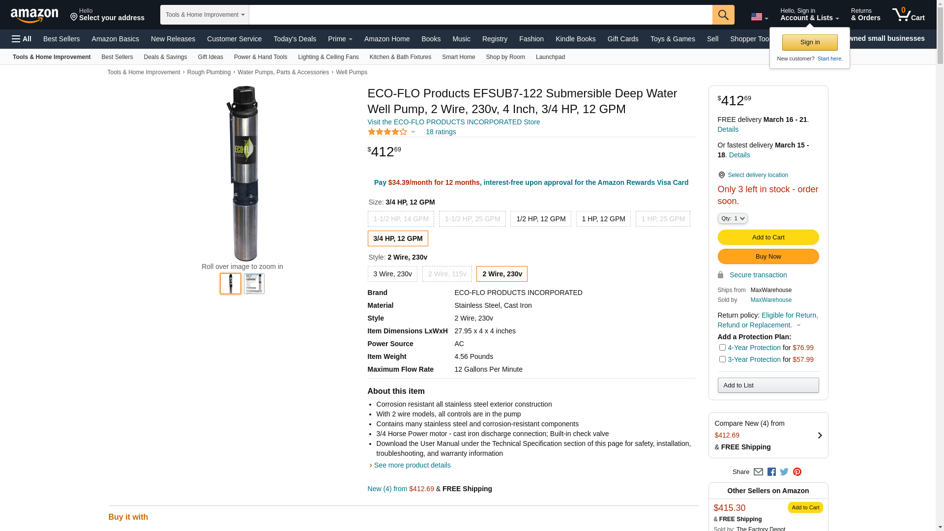 ECO-FLO Products EFSUB7-122 Submersible Deep Water Well Pump, 2 Wire, 230v, 4 Inch, 3/4 HP, 12 GPM