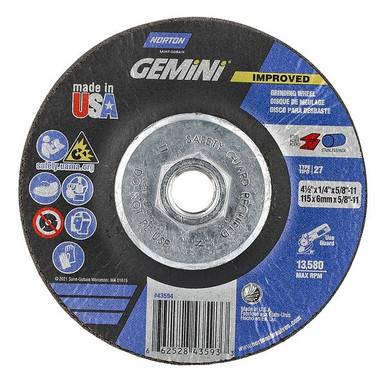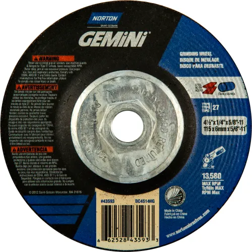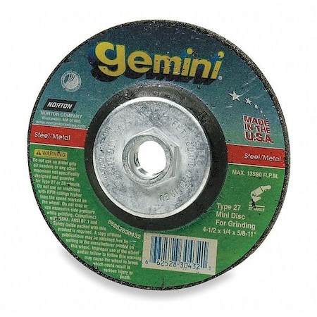 The NORTON Type 27 general-purpose grinding and cutting wheel has an aluminum oxide abrasive for cutting ferrous metals, gray iron, and stainless steel.<br /><br /> Item: Depressed Center Wheels<br /> Abrasive Wheel Type: Type 27<br /> Abrasive Wheel Diameter: 4-1/2"<br /> Thickness: 1/4"<br /> Arbor Hole Size: 5/8"-11<br /> Abrasive Material: Aluminum Oxide<br /> Abrasive Grit: 24<br /> Max. RPM: 13,580<br /> Series: Gemini<br /> Grade: Extra Coarse<br /> Application: Ferrous Metal, Gray Iron, Stainless<br />