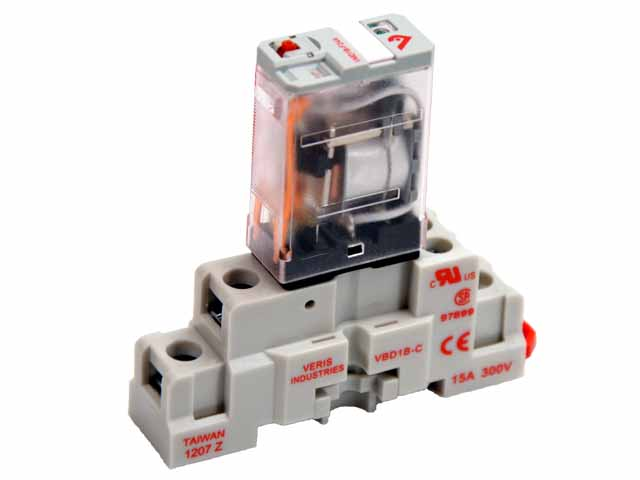 The Veris VMD1B-F Series are full-featured SPDT blade style relays for socket/DIN mounting. The VMD1B-F Series are equipped with an LED for coil proof, a flag for contact proof, an override lever, and a push-to-test button for momentary contact control. The VMD1B-F allows for instant and conclusive troubleshooting. Never wonder if the relay, control system, or wiring is the cause of a problem. The DIN-railcompatible VBD1B-F sockets feature a slim design with finger-safe terminals and a removable hold-down clip. Never struggle with wire clips again.