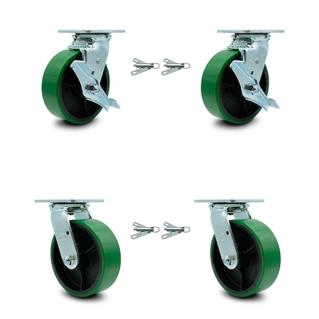 Poly on Cast Iron Swivel Caster w/Main. Free Bearings Set 4 w/6" x 2" Green Wheels-Includes 2 Swvl w/Brakes and Bolt on Swvl Lcks&2 Swvl with Bolt on Swvl Lcks-4800 lbs Total Cpty-Service Caster Brand