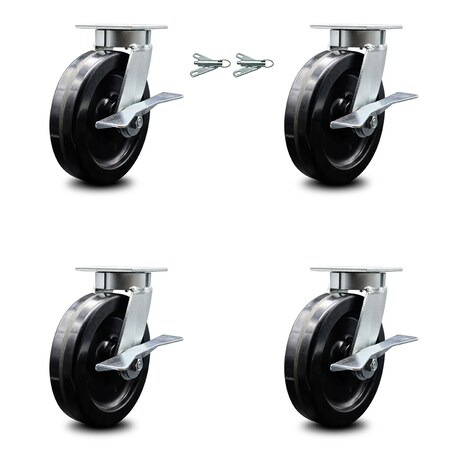 Kingpinless Phenolic Swivel Top Plate Caster Set 4 w/8" x 2" Black Wheels-Includes 2 Swivel with Brakes and Bolt on Swivel Locks&2 Swivel with Brakes-5000 lbs Total Cpty-Service Caster Brand