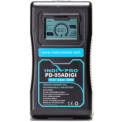 This Compact 95Wh Gold-Mount Li-ion Battery from IndiPRO Tools outputs 14.8V, has a capacity of 6.6Ah, and supports up to a 10A draw. Its features include a weight of slightly more than 1.5 pounds, and a standard D-Tap port for powering accessories via a separately available cable. For quick status checks, a built-in LCD display provides remaining power and output voltage information.