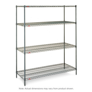A complete shelving unit in a single box. Shelves can be repositioned at precise 1" (25mm) increments along the length of the numbered posts. Open-wire design minimizes dust accumulation, allows a free circulation of air, and greater visibility of stored items. Corrosion resistant Metroseal Green epoxy finish features product protection to keep the product "cleaner between cleanings".