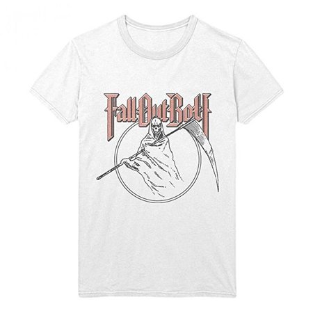 This white t-shirt from Fall Out Boy features a red group logo with a skeleton grim reaper in a circle in the center. A great design that's perfect for any fan of Fall Out Boy!