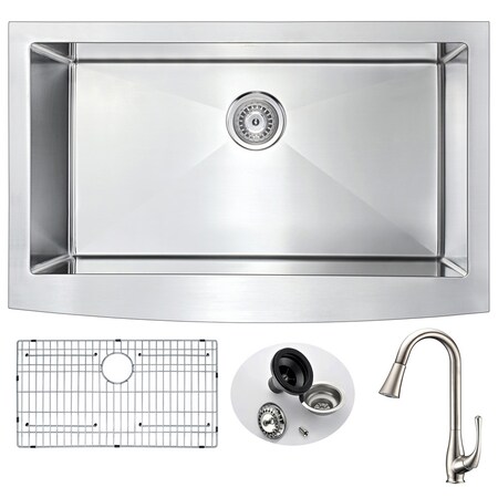 Anzzi, KAZ3620-042, , Elysian Farmhouse Stainless Steel 36 In 0 Hole Kitchen Sink And Faucet Set With Singer Faucet In Brushed Nickel