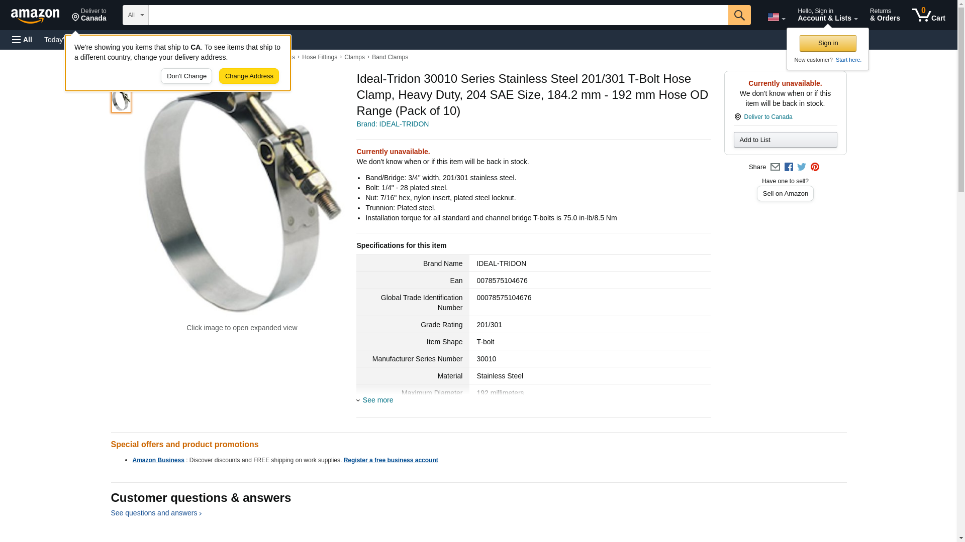 Ideal-Tridon 30010 Series Stainless Steel 201/301 T-Bolt Hose Clamp, Heavy Duty, 204 SAE Size, 184.2 mm - 192 mm Hose OD Range (Pack of 10)