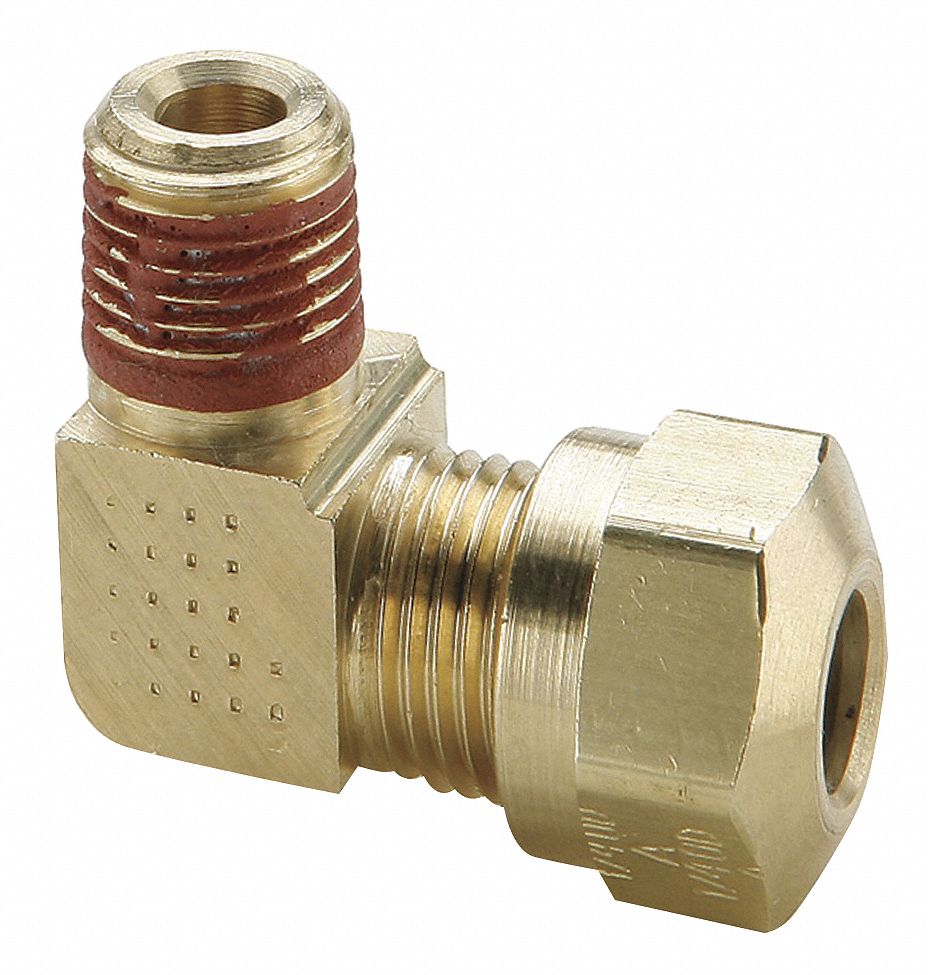 '90 Degrees Male Elbow, Type Compression, Pipe Size 1/2 In., Tube Size 3/4 In., Tube Outside Dia. 3/4 In., Thread Size 1-18, Tube x MNPT Connection, Material of Construction Brass, Pressure (PSI) 150, Temp. Range -40 to 200 Degrees F, Length 1.70 In., Compliance SAE J246, SAE J1131, DOTFMVSS 571.106'