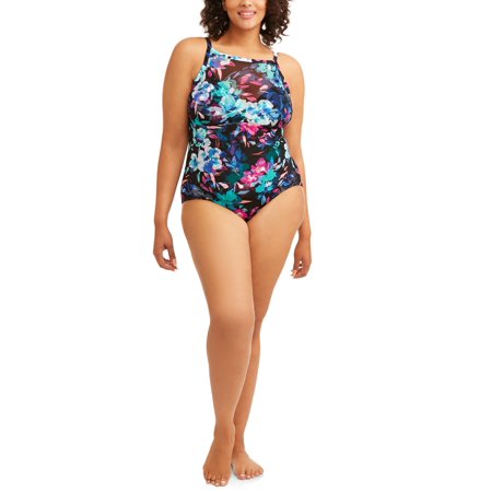 <br /> <b>Time and Tru Women's Plus Watercolor Blossom One-Piece:</b> <ul> <li> 82% nylon, 18% spandex </li> <li>Mesh insert highneck with low back opening </li> <li>One-piece </li> <li>Removable cups </li> <li>Full coverage </li> <li>Adjustable straps </li> <li>Available in multicolor </li> <li>Machine wash cold, gentle cycle, wash with like colors, do not bleach, line dry, do not iron</li> </ul>