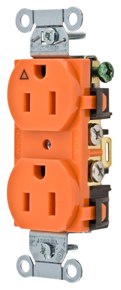 Hubbell straight blade isolated ground receptacles uses insulation barrier construction on to isolate the ground contacts from the mounting strap. The green grounding screw is connected directly to the grounding contacts. In this way, ground contacts are separated from the mounting strap and also from the conventional grounding system. The isolated ground circuit is completed by running a dedicated insulated ground wire from the system ground buss to the green grounding screw. Wrap-around, locked on brass mounting strap provides additional support strength for receptacle assembly. Amperage and voltage clearly indicated. Back and side-wiring capability provides easy installation with stranded or solid wire. Dimensionally stable, reinforced thermoplastic polyester provides impact strength in addition to heat and flame resistance. Impact-resistant nylon face. Available in 19 NEMA configurations. With grounding method, isolated ground devices can be mounted in boxes, on metal panels almost anywhere. Every isolated ground device meets and exceeds all applicable codes and standards, plus the toughest standard of all. Isolated ground triangle on the face of the receptacle clearly indicates isolated ground device. Smooth face, back and side wired. NEMA 5-15R.