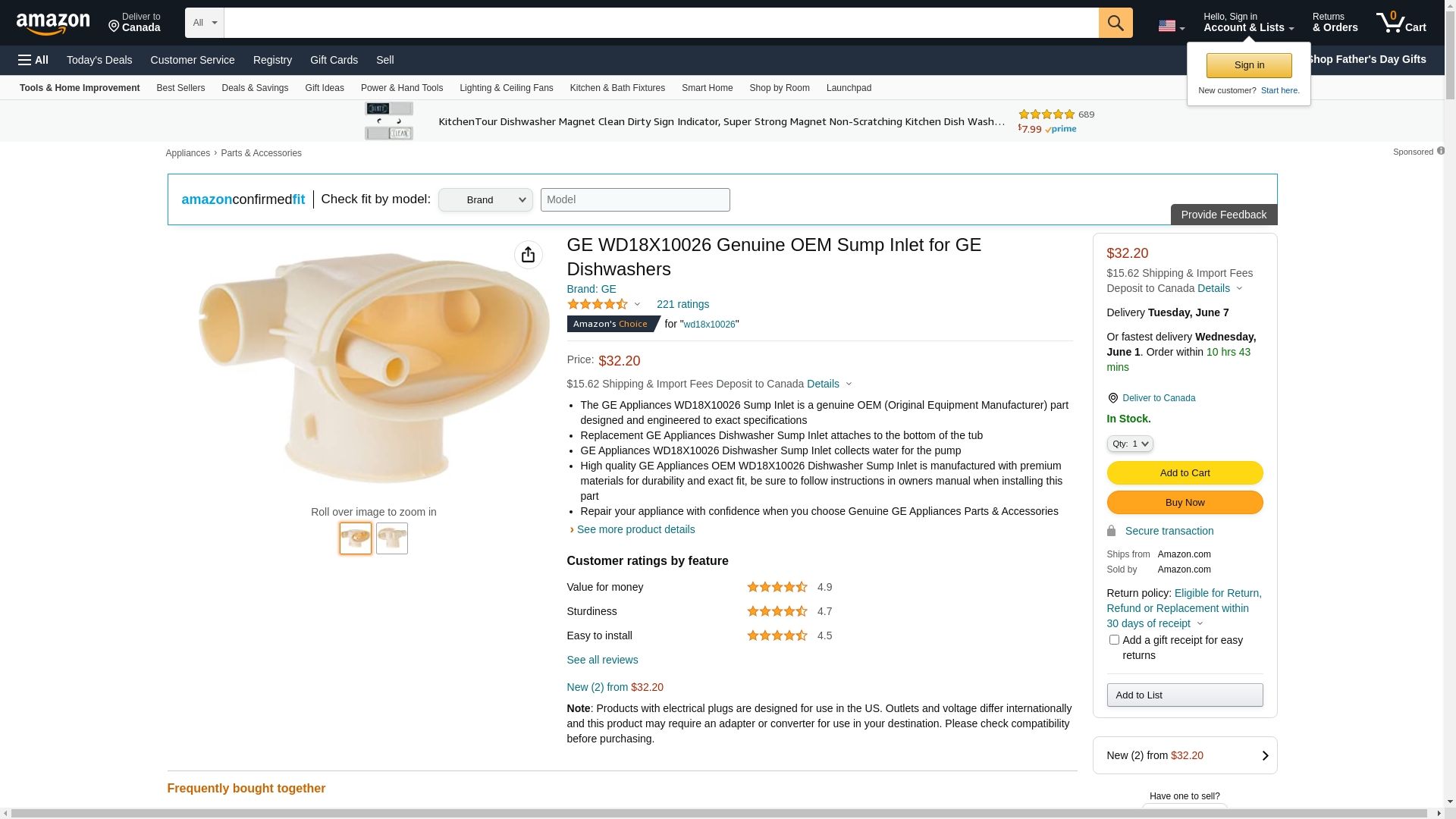 ![]() midwestapplianceparts.com | WD18X10026-GEH-P | 1 | -2 | 1 | 1 @ $37.59 |