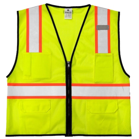 <ul><li>100% polyester mesh</li><li>Zipper front closure</li><li>2" wide silver laminated reflective material with 3" solid contrasting color</li><li>Left chest mic tab</li></ul>