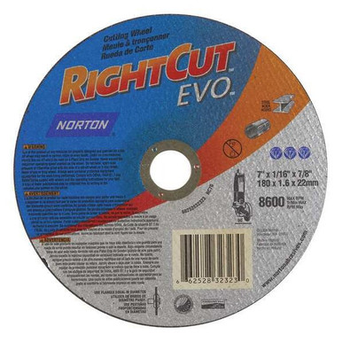 'Abrasive Cut-Off Wheel, Abrasive Wheel Type Type 1, Abrasive Wheel Diameter 7 In., Thickness 0.0625 In., Arbor Hole Size 7/8 In., Abrasive Material Aluminum Oxide, Abrasive Grit 60, Max. RPM 8600, Series Gemini Right Cut EVO, Diamond Knockout No, Application Ferrous Metal, Gray Iron, Stainless'