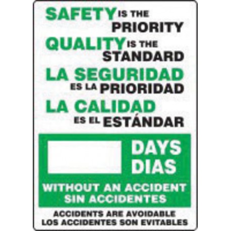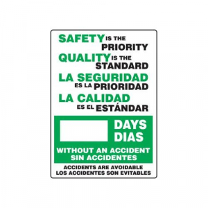Accuform SBMSR129PL Plastic Spanish Bilingual Write-A-Day Safety Scoreboard, "SAFETY IS THE PRIORITY QUALITY IS THE STANDARD - #### DAYS WITHOUT AN ACCIDENT - ACCIDENTS ARE AVOIDABLE", 20" Length x 14" Width x 0.125" Thickness, Green/Black on White