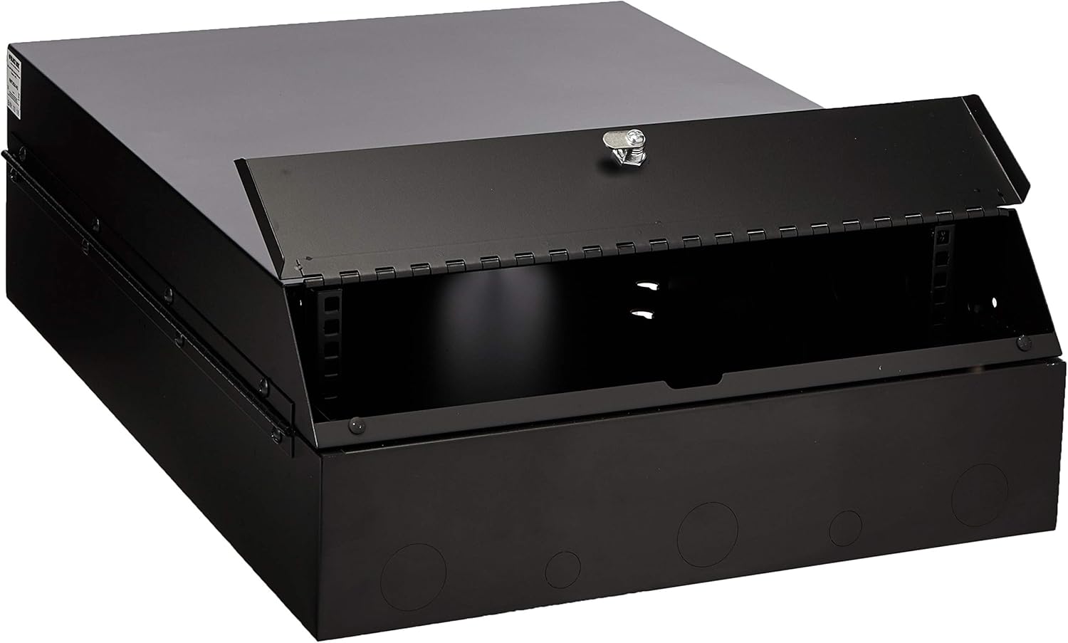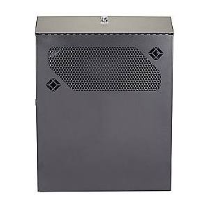Holds up to 200 pounds (90.9 kg). Perfect for small network equipment and tight networking environments. Mounting rails are 19" EIA-310 with square holes for M6 cage nuts (included). Mounting rails have 4" of vertical adjustment inside cabinet. Includes four 1-inch cable conduit knockouts on the top and bottom Top door flips down and enables equipment access. Front door provides maintenance access. Both lock with separate keys. Front door is reversible for left or right opening. High area-mesh provides secure cooling of equipment. Heavy-duty piano hinges ensure secure door-to-body connections. Space too tight for a full-sized cabinet or rack? Mount your networking equipment vertically in our Low-Profile Vertical Wallmount Cabinet. This keeps networking equipment out of the way while connectors stay easily accessible. Locking, heavy-duty 18-gauge steel cabinet is a good choice for industrial spaces and small organizations; wallmountable up to 200 pounds of equipment. To secure equipment, both the top panel and front door lock. Mesh cutouts on the front door keep equipment cool. The interior design of the cabinet provides four inches of space for cables and cable managers The cabinet includes adjustable square-hole rails.
