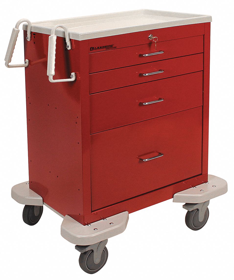 Lakeside® C-424-K-1R Classic 4 Drawer Medical Emergency Cart, Red, Key Lock
