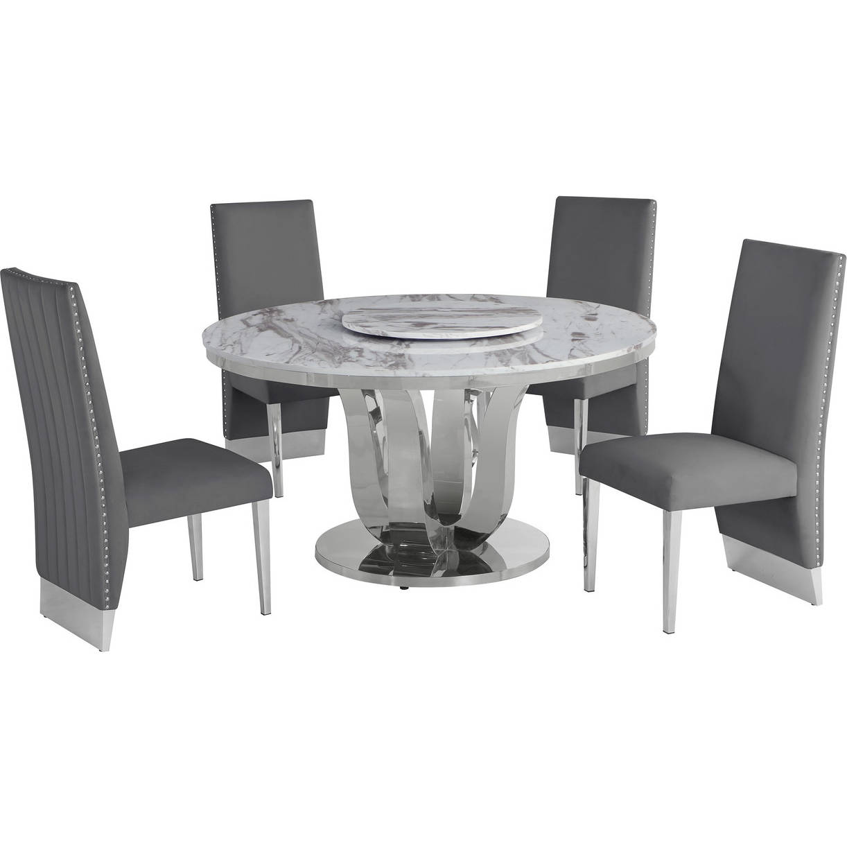 Best Quality D16L-4SC164 D16 6 Piece Dining Set w/ Lazy Susan in White Marble, Stainless & Dark Gray Velvet