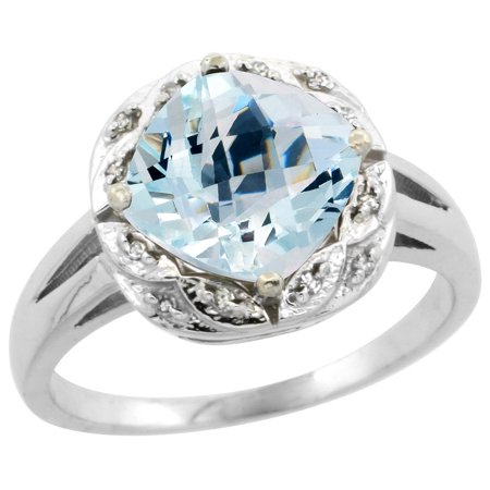 10k White Gold Natural Aquamarine Ring Cushion-cut 8x8mm Diamond Halo, sizes 5-10